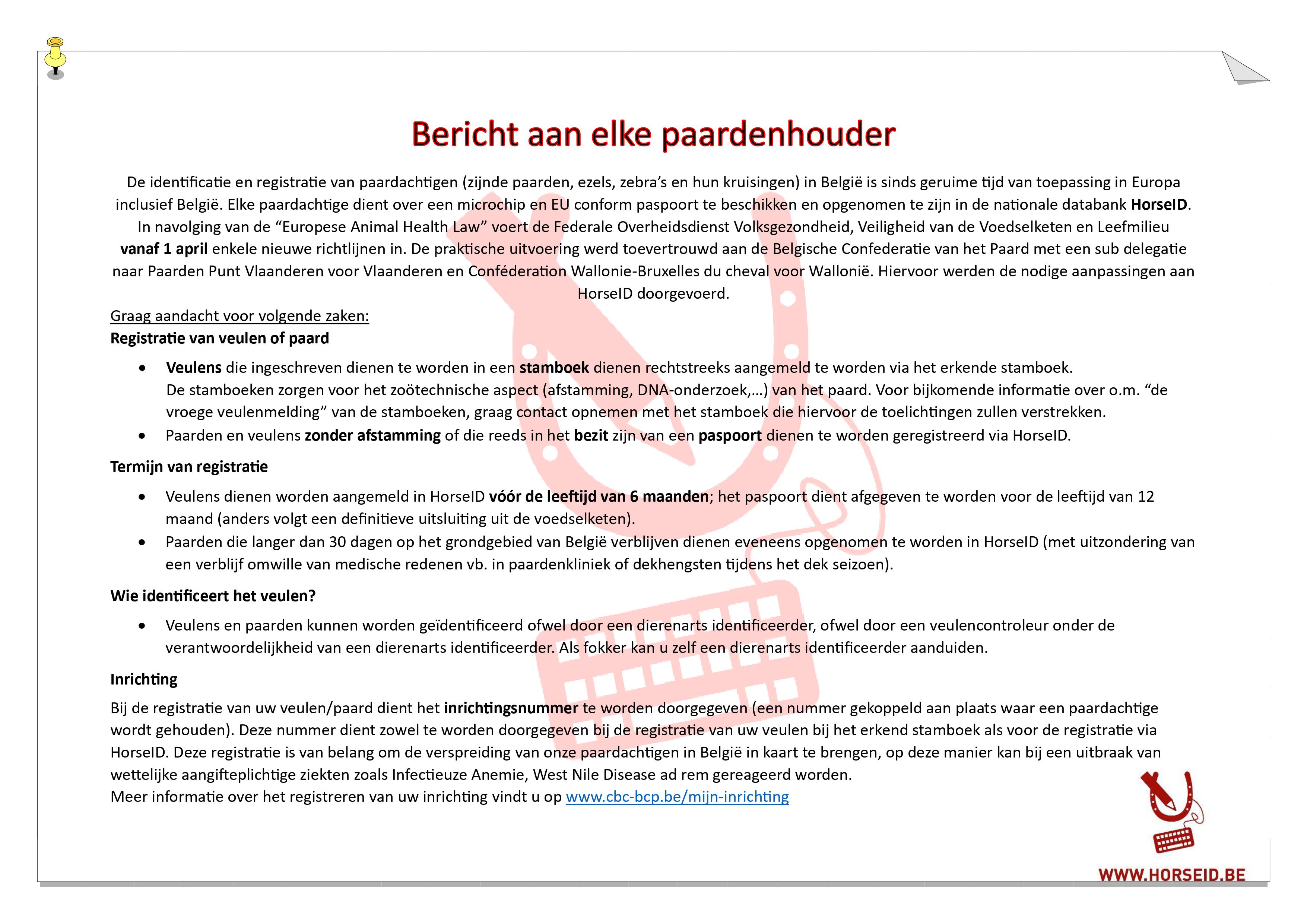 Gelieve hiermee rekening te houden en indien U nog niet over een inrichtingsnummer beschikt, graag dringend in orde brengen bij Horse Id aub.